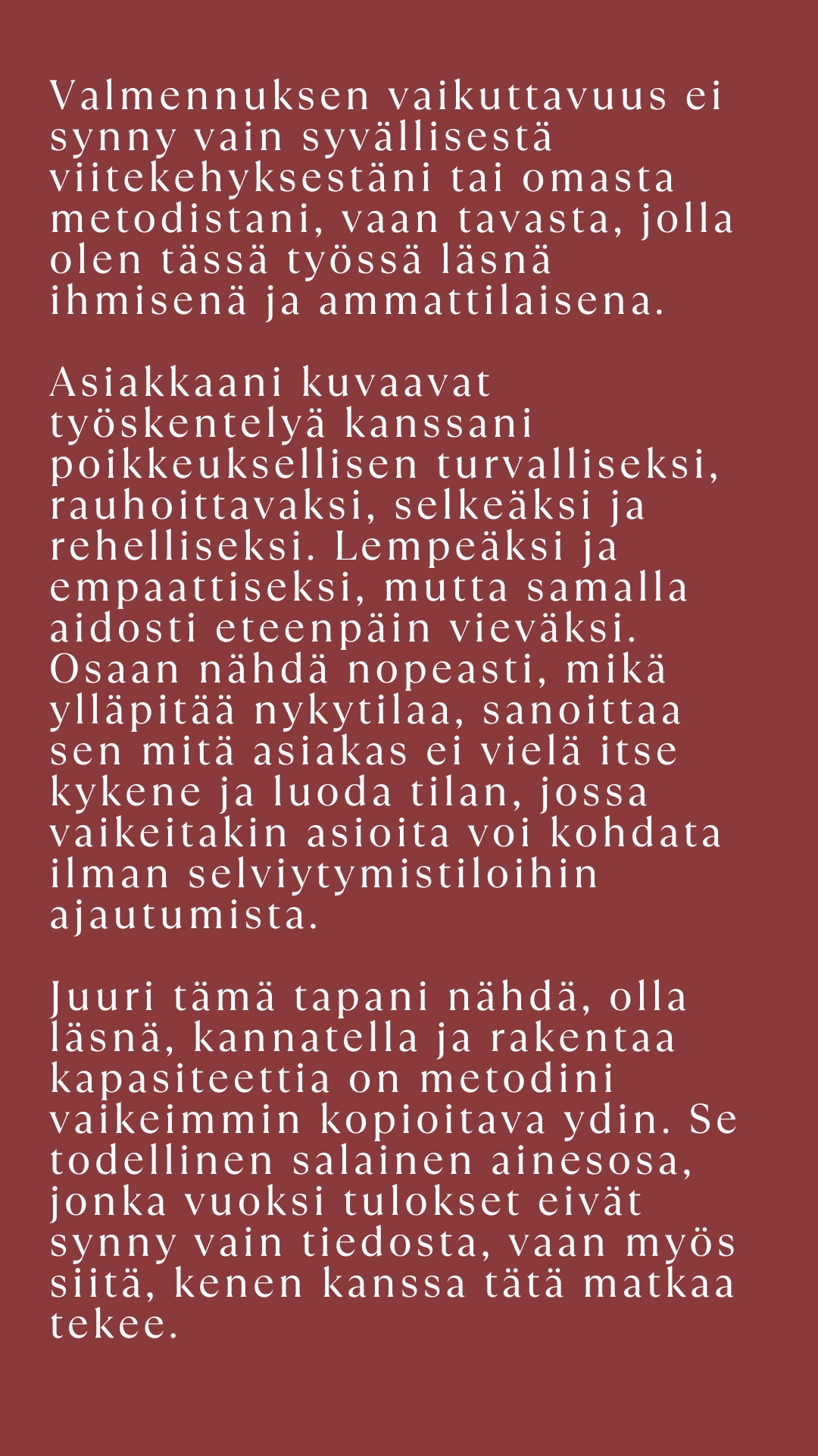 Minulle on tärkeää, että jokainen valmennettava tulee aidosti nähdyksi ja kuulluksi, aivan erityisesti silloin, kun taustalla on pitkä matka etsimistä, kokeilemista ja pettymyksiä. Tiedän, että monelle matka tähän asti on jo ollut suuri ponnistus. Valmennuksessani et joudu sopeutumaan valmiisiin kaavoihin. Kuljen rinnallasi, jotta voimme yhdessä löytää ne rakenteet, jotka todella palvelevat juuri sinua. Jokainen valmennettava on minulle tärkeä, ja molemminpuolinen luottamus on kaiken ytimessä.