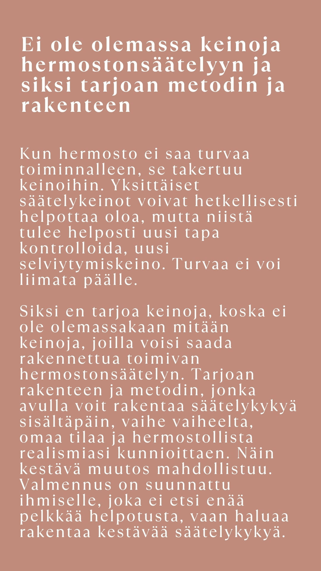 Hermostonsäätely ei rajoitu vain toipumisen mahdollistamiseen tai oireiden helpottumiseen. Se avaa mahdollisuuden elää omannäköistä, vapaata ja merkityksellistä elämää.