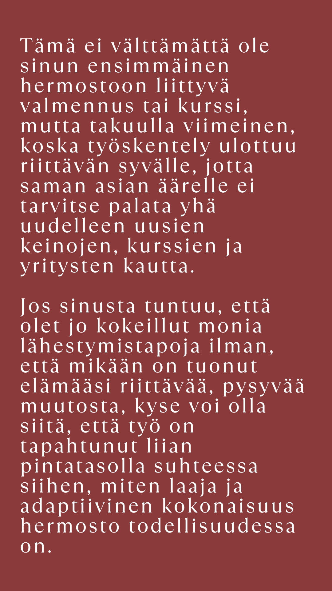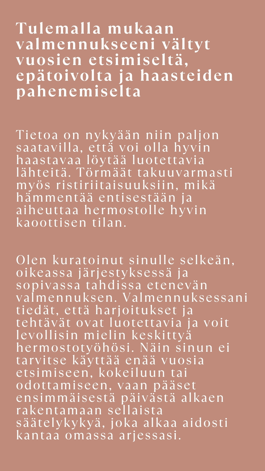 Tässä valmennuksessa et enää pyri palautumaan illalla siitä, mikä kulutti päivällä. Vaan rakennat itsellesi tavan olla, jossa toimintakyky ja lepo virtaavat omasta tilasta, jossa sinun ei tarvitse enää suojautua ja suorittaa. Tämä on syvä, intensiivinen ja kannateltu prosessi, joka ei rakenna elämää ja säätelyä jonkun toisen standardien mukaan, vaan sinulle, sinun tahdissasi, sinun hermostosi ehdoilla.